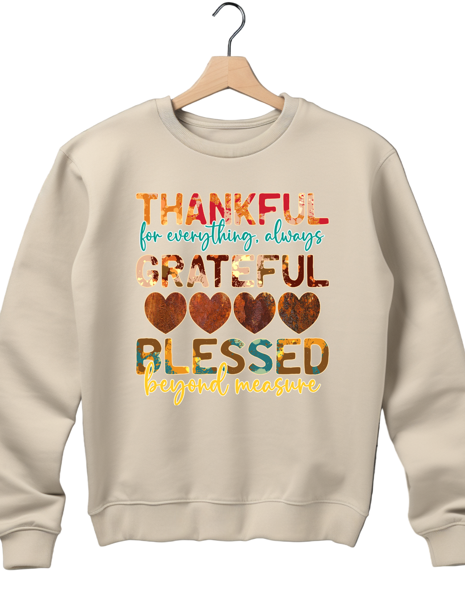 This multicolor design celebrates the full spectrum of thankfulness—layered with love, joy, and a reminder that you’re blessed beyond measure. It’s the loudest praise in the softest fleece - hearts, hues, and holy perspective!
